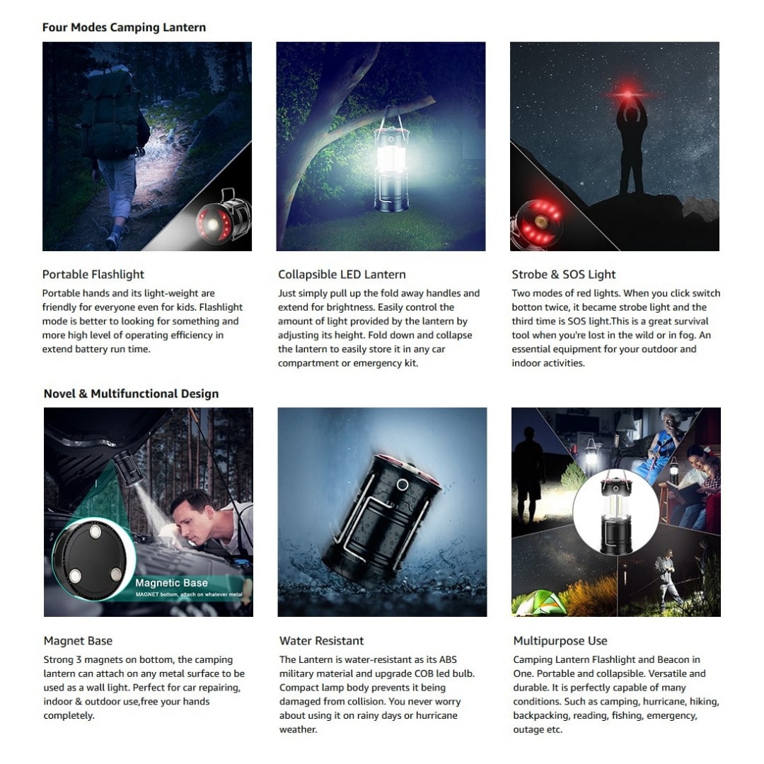 Esta linterna LED esencial para campamento y emergencias está diseñada para ofrecer iluminación potente de 360°, ideal para cortes de energía, kits de supervivencia y actividades al aire libre. Gracias a sus bombillas COB de última generación, proporciona una cobertura amplia y uniforme que ilumina espacios grandes con alta visibilidad.